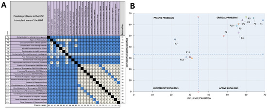Microbiological risk analysis in the HSC transplant area at HJM. (A) Vester matrix of 24 controversial situations of potential microbiological contamination. (B) Identification and classification of problems according to the influence and dependency on the identified problems.