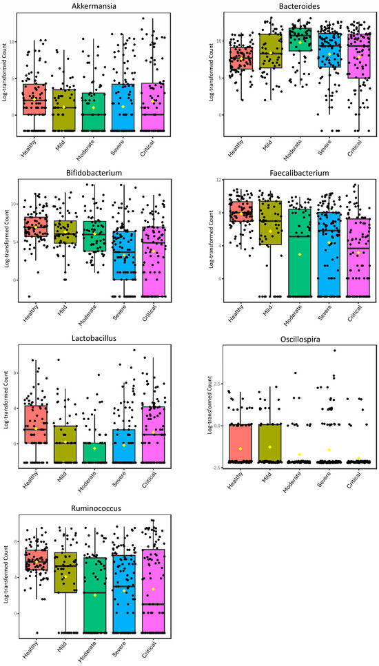 Boxplots of the relative abundance of the genera Akkermansia, Bacteroides, Bifidobacterium, Faecalibacterium, Lactobacillus, Oscillospira, and Ruminococcus in healthy controls and at different levels of severity of COVID-19. The Lefse analysis is presented in Table S1.