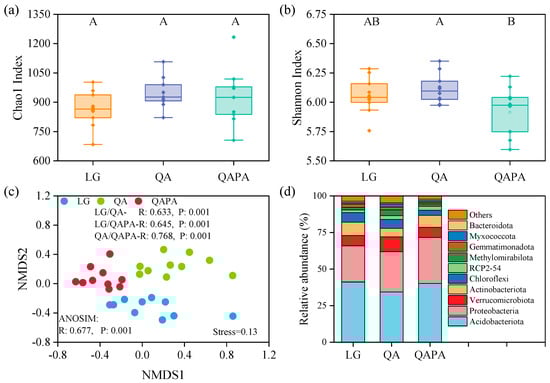 Soil diversity and community composition of different forest types. (a): Chao1; (b): Shannon index; (c): NMDS analysis. The distance between the samples represents the degree of difference, and the samples from the same group are represented by the same color. (d): Relative abundance of community at the phylum level. Different uppercase letters indicate significant differences among the forest soils (p < 0.05), and the same applies below.