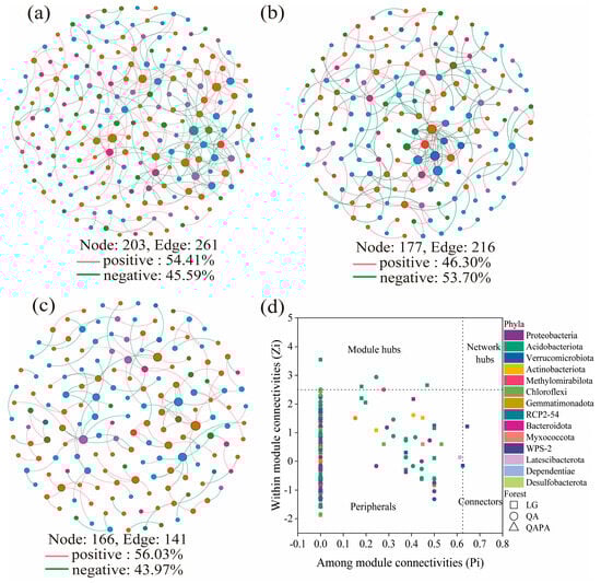 Co−occurrence networks and of the soil bacterial community in LG (a), QA (b), and QAPA (c), Zi–Pi plots showing the keystone species of bacteria (d) in different forests. The nodes represent the amplicon sequence variants (ASVs), and the size of each node is proportional to the degree of the ASVs.