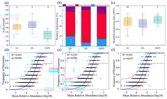 Niche breadth (a), null model (b), modified stochasticity ratio (c), and neutral community model ((d) LG; (e) QA; (f) QAPA) of soil bacteria in different forest types. The solid blue line represents the best-fit values of the neutral community model, the dashed blue line represents the 95% confidence interval of the model (estimated through 999 bootstraps), and OTUs with occurrence frequencies higher or lower than predicted by the neutral community model are displayed in different colors.