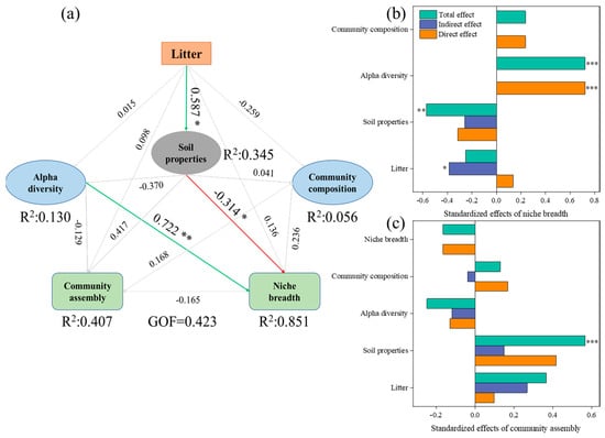 Effects of litter and soil properties on niche breadth and community assembly (a). The adjusted (adj.) R2 of the averaged model and the p-value of each variable are given as * p < 0.05, ** p < 0.01, and *** p < 0.001; red line: negative effects; green line: positive effects. The standardized effects of SEM ((b) niche breadth; (c) community assembly).