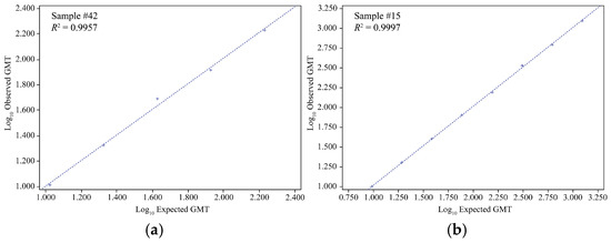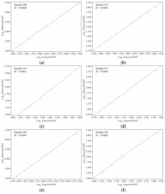 All the virus strain samples with an expected HAI GMT of ≥8 were included in the linear regression and percent relative bias analyses. The linearity of both the egg-derived HAI and VLP HAI assays was successfully demonstrated, with R2 ranging from 0.9814 to 0.9999 and from 0.9777 to 0.9999, respectively, for all individual samples examined for each egg-derived virus or VLP agglutinin, meeting the acceptance criterion (regression line R2 ≥ 0.95) (Figure 1 and Figure 2; Tables S2 and S3). Also, the percent relative bias for all samples (for both the egg-derived virus and VLP agglutinins) was in the acceptance range (−50% to 100% of the expected HAI GMT). In the egg-derived HAI, the %GCV of all samples was <50%. In the VLP HAI, the %GCV was <50% for all the sample dilutions, except for one sample dilution for B/Phuket/3073/2013 VLP (%GCV of 54.5) (acceptance criteria: %GCV ≤ −60% (Tables S4 and S5).