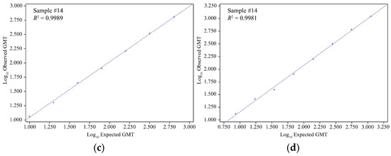 Linearity results of egg-derived virus HAI assay for influenza virus strains. (a) A/Kansas/14/2017, (b) A/Brisbane/02/2018, (c) B/Maryland/15/2016, and (d) B/Phuket/3073/2013. GMT, geometric mean titer; HAI, hemagglutination inhibition; R2, coefficient of determination.