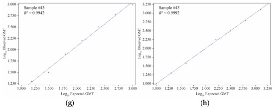 Linearity results of VLP HAI assay for strains. (a) A/Kansas/14/2017, (b) A/Brisbane/02/2018, (c) B/Maryland/15/2016, (d) B/Phuket/3073/2013, (e) A/California/94/2019, (f) A/Cardiff/0508/2019, (g) A/Netherlands/1268/2019, and (h) A/Tokyo/EH1801/2018. GMT, geometric mean titer; HAI, hemagglutination inhibition; R2, coefficient of determination; VLP, virus-like particle.