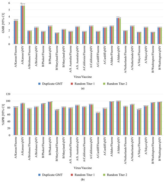 The GMR, %SPR, as well as %SCR, and their corresponding 95% CI from paired duplicates or randomly selected single titers were very similar for each virus strain and protocol arm pair (Figure 3). Overall, these findings showed that reporting titers in singleton had no impact on the four key clinical metrics of GMT, GMR, SPR, and SCR.