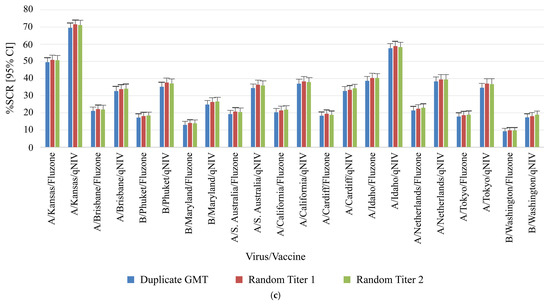 Comparison of clinical samples from qNIV-E-301 using duplicate results compared to random titer (singleton) for key study parameters. (a) Geometric mean ratio, (b) Seroprotection rate, and (c) Seroconversion rate for homologous and drifted seasonal influenza strains. Geometric mean ratio (GMR) was defined as the ratio of post-vaccination and pre-vaccination HAI GMTs within the same treatment group [23]. Seroprotection was defined as a titer of ≥1:40 (a titer that gives a 50% reduction of disease) [7]. Seroconversion was defined as HAI titer post-vaccination meeting one of the following criteria: either pre-vaccination titer < 1:10 and post-vaccination titer ≥ 1:40, or pre-vaccination titer ≥ 1:10 and at least a 4-fold increase in post-vaccination titer [24,25]. CI, confidence interval; GMR, geometric mean ratio; GMT, geometric mean titer; HAI, hemagglutination inhibition; SCR, seroconversion rate; SPR, seroprotection rate; VLP, virus-like particle.