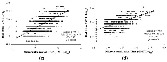 To evaluate the concordance of the HAI results with the MN assay, correlation analysis was performed using four different influenza strains. Results of the HAI for both A and B strains demonstrated a significant positive correlation with the qualified MN assays: A/Brisbane/02/2018 (Pearson’s r = 0.84, R2 = 0.70, p < 0.0001; Figure 4a), A/Kansas/14/2017 (Pearson’s r = 0.85, R2 = 0.73, p < 0.0001; Figure 4b), B/Maryland/15/2016 (Pearson’s r = 0.74, R2 = 0.55, p < 0.0001; Figure 4c), and B/Phuket/3073/2013 (Pearson’s r = 0.69, R2 = 0.47, p < 0.0001; Figure 4d).