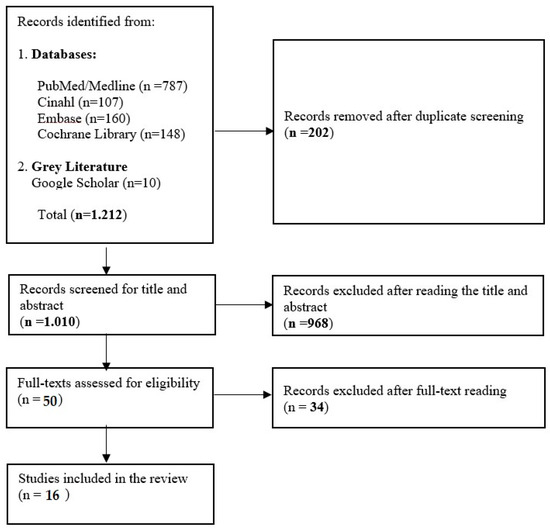 A total of 1202 records were identified through electronic database searches: PubMed/Medline (n = 787), Embase (n = 160), CINAHL (n = 107), Cochrane Library (n = 148), and 10 additional records from gray literature sources via the Google Scholar database. After removing 202 duplicates, 1010 records remained for evaluation. Following a review of titles and abstracts, 968 records were deemed irrelevant, leaving 50 records for full-text screening. At this stage, 34 articles were excluded for not meeting the defined inclusion criteria, resulting in 16 records being included in this narrative review (Figure 1).