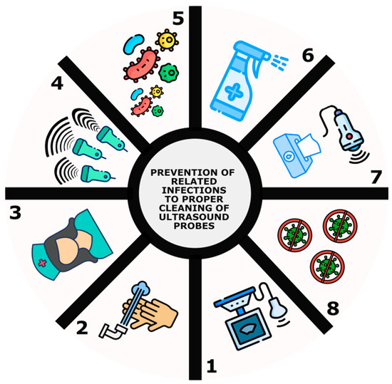 - Koibuchi, H.; Kotani, K.; Taniguchi, N. Ultrasound probes as a possible vector of bacterial transmission. Med. Ultrason. 2013, 15. [Google Scholar] [CrossRef] [PubMed]