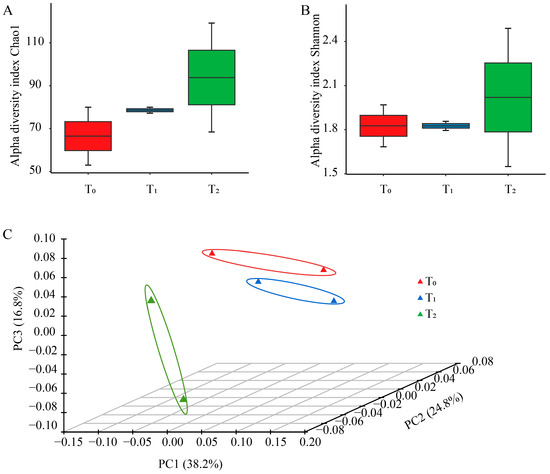 The Chao 1 and Shannon index affiliated with alpha diversity were utilized to reflect the richness and diversity of seed bacterial endophytes among the three seed generations. The means of Chao 1 richness calculated for consecutive generations were 66.5, 78.6 and 93.8 in T0, T1 and T2, respectively. Similarly, the mean of the Shannon index of T2 and was the highest among the three seed generations, larger than that of T0, and T1 (Figure 1A,B). For principal coordinate analysis, 79.8% of the variance was explained by the first three coordinates. The distance between T0 and T1 was short, while T2 was far from them (Figure 1C), suggesting that the community structure of T0 and T1 was more similar than that of T1 and T2, likely due to the difference between planting areas.