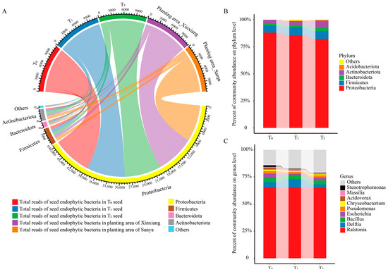 Community composition and taxa classification among three successive seed generations. (A) Chordal diagram of the bacterial community structure at the phylum level among three seed generations and two planting areas. Taxa with a proportion lower than 1% were summarized as Others. (B) Community composition at the phylum level in three seed generations. (C) Community composition at the genus level in three seed generations. T0, T1 and T2 represent three consecutive seed generations, respectively.