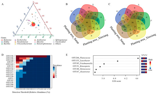 Within the top 10 genera, Ralstonia, Bacillus, Pseudomonas, Chryseobacterium and Sphingomonas were nearly equally distributed among the three seed generations (Figure 2C, Figure 3A). Acidovorax and Stenotrophomonas were more abundant in the T0 generation, while Delftia and Massilia were more enriched in the T1 generation (Figure 3A). The abundance of Escherichia was similar between the T0 and T1 generations, but it was relatively lower in the T2 generation (Figure 3A). Through comparing the similarities and differences of the three successive seed generations and the two planting areas, 46 genera and 56 OTUs were found to exist in all three generations and in both planting areas, suggesting that these OTUs were conserved and could be transferred through vertical transmission (Figure 3B,C). Within the 56 OTUs, 16 of them were core OTUs with high abundance and prevalence, but only 10 OTUs were annotated at the species level (Figure 3D, Table 1). Moreover, there were 156 OTUs that were flexible among different seed generations and planting locations. The dominant OTUs were annotated to Ralstonia solanacearum, Delftia tsuruhatensis and Bacillus velezensis (Table 1). Moreover, there were 29 genera and 37 OTUs that were unique to Xinxiang, and 55 genera and 84 OTUs were unique to Sanya (Figure 3B,C). Through LEfSe analysis, six OTUs (OTU48, OTU51, OTU67, OTU83, OTU133, OTU244) showed prominent differences among three generations (Figure 3E). Among them, OTU244, belonging to Planococcus, was more enriched in the T1 generation, and OTU133, affiliated with Leucobacter, was more abundant in the T0 generation, while OTU48, OTU51, OTU67 and OTU83 were more enriched in T2 generation. The above results indicate that the conserved core OTUs could be transmitted vertically through seed generations, while some unique OTUs that exist within different seed generations could be transmitted horizontally for adaptation to external environments.