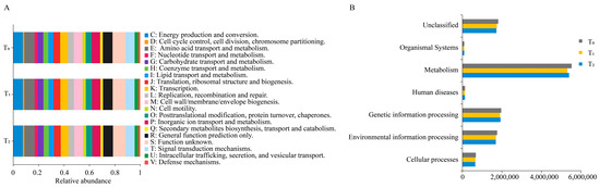 Metataxonomic function prediction of seed endophytic bacteria of three consecutive seed generations. (A) Function predictions were categorized based on COG classification. The abscissa represents the relative abundance of different functional categories based on the COG database, while the ordinate represents three consecutive seed generations. (B) Function predictions were categorized based on KEGG classification at level 1. The variation in the ordinate represents the different function items on the KEGG pathway level 1. T0, T1 and T2 represent three consecutive seed generations, respectively. The values in the abscissa represent the relative abundance of corresponding functions in the samples.