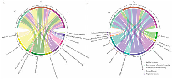The major functions predicted for seed bacterial endophytes were enriched in metabolic functions. (A) Function predictions about metabolism were categorized based on KEGG classification at level 2. (B) Function predictions about genetic information processing, environmental information processing and cellular processes were categorized based on KEGG classification at level 2. T0, T1 and T2 represent three consecutive seed generations, respectively. The values represent the relative abundance of corresponding functions in the samples.