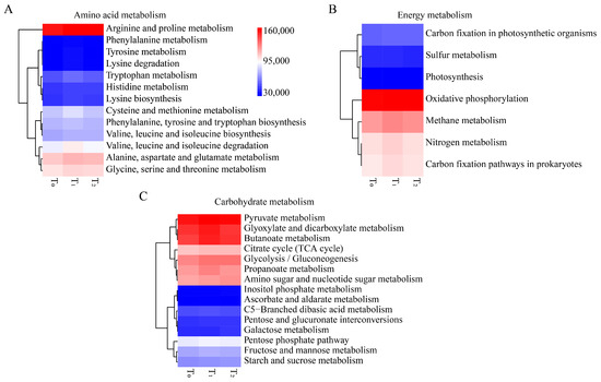 Functional prediction of maize seed bacterial endophytes that might involve amino acid metabolism, energy metabolism and carbohydrate metabolism. (A) Heatmap of relative abundance of amino acid metabolism. (B) Heatmap of relative abundance of carbohydrate metabolism. (C) Heatmap of relative abundance of energy metabolism. T0, T1 and T2 represent three consecutive seed generations, respectively. The values represent the relative abundance of corresponding functions in the samples, and the colors blue, white and red represent the values at low, middle and high levels, respectively.