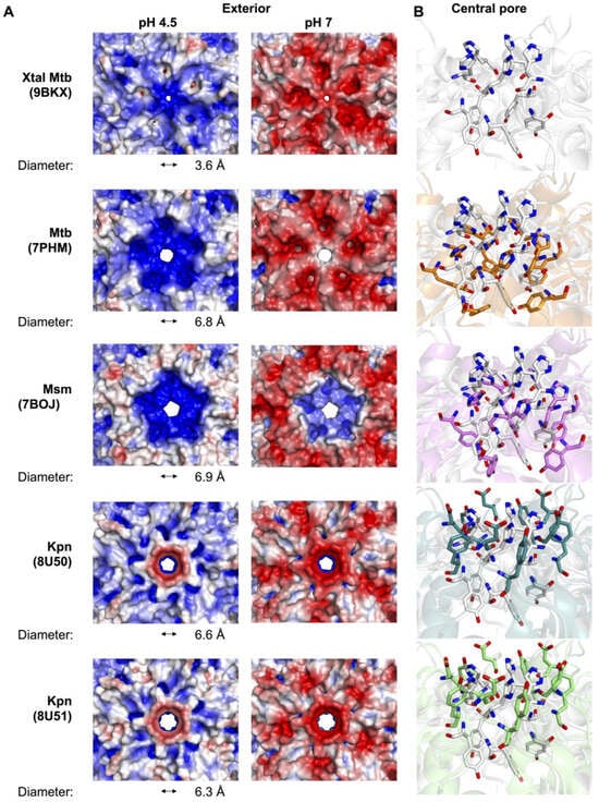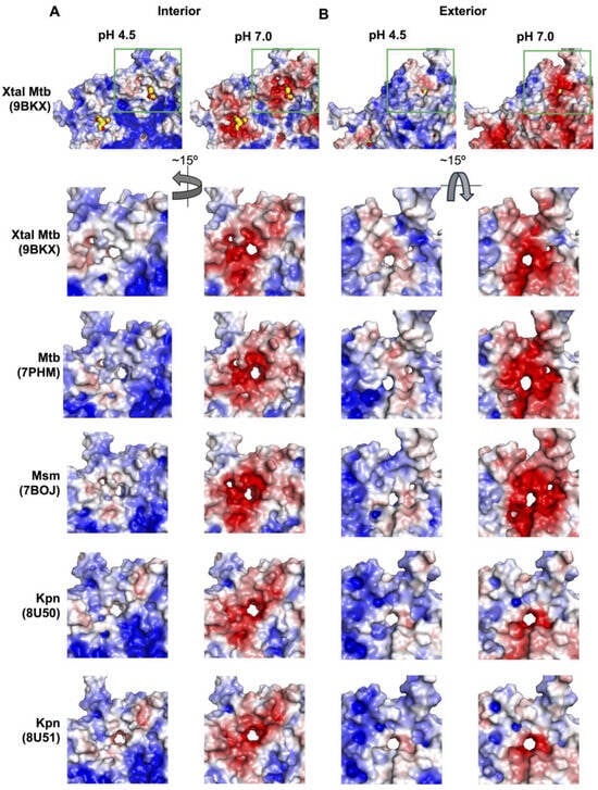 If we compare the electrostatic surface at the five-fold minor pores amongst a series of Enc nanocompartment structures, we find that at pH 7, the mycobacterial structures all show strong negatively charged surfaces on the exterior and interior of the shell (Figure 4). Interestingly, for Kpn-Enc structures, we see a strong negatively charged surface at the interior, but a mixture of negatively charged and neutral surfaces on the exterior of the shell. However, at pH 4.5, the five-fold minor pores are more neutral; in some cases, the surface of the five-fold minor pore displays mixed charges (e.g., PDB IDs 7PHM, 7BOJ, and 8U50) and in others it is slightly negative (e.g., PDB IDs 9BKX and 8U51). Interestingly, this difference does not follow species or sequence variation, but rather DyP loading: the mixed-charge five-fold minor pores are found in apo Mtb- and Kpn-Enc structures, and the slightly negative five-fold minor pores are found in DyP-loaded Mtb-, Msm-, and Kpn-Enc structures. This difference could indicate the presence of the cargo protein signaling for, or directing, the internalization of the DyP substrate (i.e., H2O2) through the five-fold pore.
