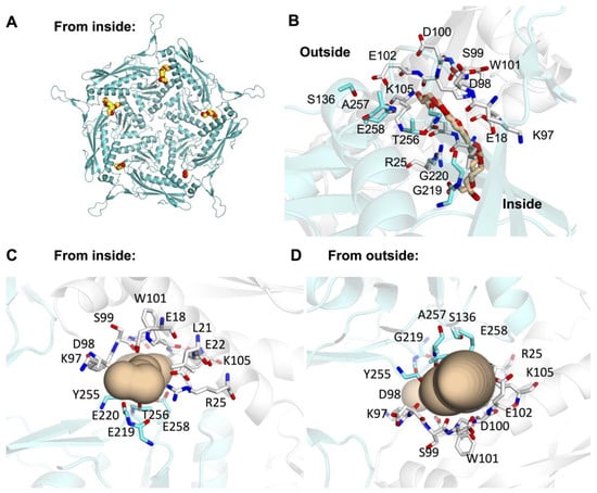 - Pravda, L.; Sehnal, D.; Toušek, D.; Navrátilová, V.; Bazgier, V.; Berka, K.; Vařeková, R.S.; Koča, J.; Otyepka, M. MOLEonline: A web-based tool for analyzing channels, tunnels and pores (2018 update). Nucleic Acids Res. 2018, 46, W368–W373. [Google Scholar] [CrossRef]