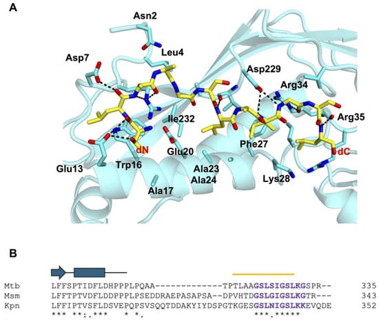 While there are few H-bonds formed between Mtb-DyP-TP and Mtb-Enc, there is a vast network of nonbonded contacts, including hydrophobic and van der Waals interactions, ranging from 33 nonbonded contacts for peptide r to 87 for peptide i (the longest peptide modeled). Consistent nonbonded contacts are provided by Mtb-Enc Ala24, Phe27, Lys28, Ile31, Arg34, Arg35, Val39, Asp229, and Val230 (Figure 5A and Figure S2).