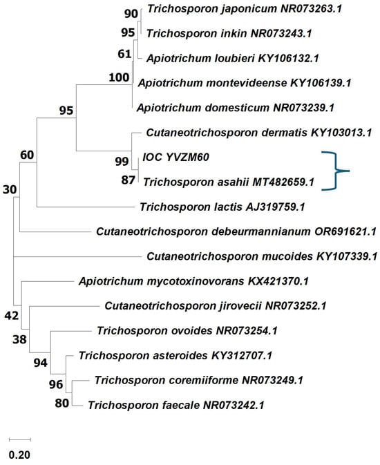 Phylogenetic analysis based on the amplification of the ITS1-5.8S-ITS2 region of ribosomal DNA using the BLAST search algorithm for comparison with the sequences deposited in the NCBI/GenBank database. The blue curly bracket shows the relationship between IOCYVZM60 and T. asahii MT482659.1. The numbers in the figures indicate a percentage of similarity.