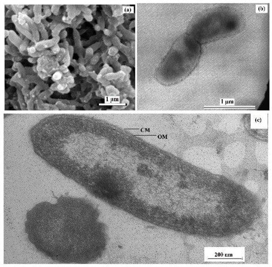 Cells of the sulfate-reducing strain 9FUST were non-spore-forming, curved rods, 0.3–0.5 µm in diameter and 1–2 µm long, motile in the exponential growth phase due to a single polar flagellum (Figure 1a,b). The cells were Gram-stain-negative and had Gram-negative cell wall structure, which was confirmed by the presence of an inner cytoplasmic membrane and an outer lipoprotein membrane on microphotographs of ultrathin cell sections (Figure 1c).
