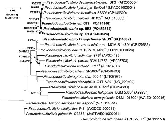Maximum-likelihood phylogenetic tree based on 16S rRNA gene sequences (1444 nucleotide sites), demonstrating the position of strain 9FUST within the genus Pseudodesulfovibrio. White circles indicate that the relevant nodes were recovered using the neighbor-joining algorithm; black circles indicate that the relevant nodes were also recovered based on the neighbor-joining and maximum-parsimony algorithms. Bootstrap values (>50%) are listed as percentages at the branching points. Bar, 0.05 substitutions per nucleotide position. The tree was rooted using Desulfovibrio desulfuricans ATCC 29577T as the outgroup. GenBank accession numbers for 16S rRNA genes are indicated in parentheses. The name of the studied strain is marked in boldface.