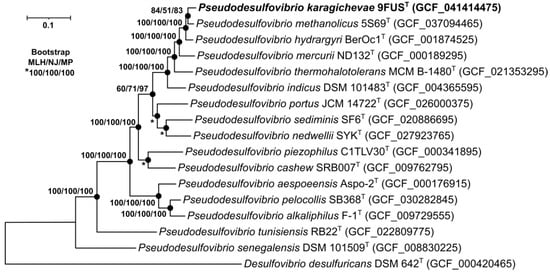 On the 16S rRNA gene phylogenetic tree, constructed using the MLH, NJ, and MP methods (Figure 2), strain 9FUST clustered within a well-supported clade, which included ‘P. methanolicus’ 5S69T, P. hydrargyri BerOc1T, P. mercurii ND132T, ‘P. thermohalotolerans’ MCM B-1480T, and P. indicus J2T. These results confirm that strain 9FUST belongs to the genus Pseudodesulfovibrio. Comparison of the 16S rRNA gene sequences of strain 9FUST revealed that the strain had similarities ranging from 92.8% to 98.9% with members of the genus Pseudodesulfovibrio (Table 3). However, it was impossible to definitively determine whether strain 9FUST represents a new species, as its 16S rRNA gene sequence is similar to ‘P. methanolicus’ 5S69T, which exceeds 98.7% [44,45], which is the typical threshold for species delineation. To resolve this, whole-genome sequencing and further comparative genomic analyses were performed to assess additional genomic features and clarify the taxonomic position of strain 9FUST.