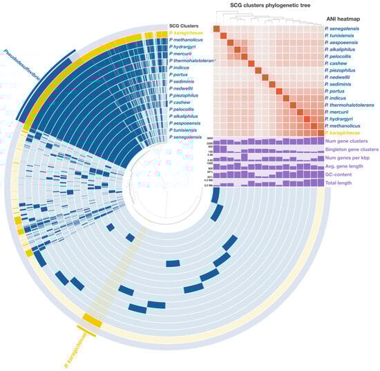 Pangenome analysis of sixteen Pseudodesulfovibrio species calculated with Anvi’o v. 8.0. The central dendrogram illustrates the relationships between 12,348 gene clusters (55,478 genes) across the analyzed genomes. Dark circular regions indicate the presence of specific genes in each genome. A phylogenetic tree was reconstructed based on single-copy genes, providing insights into the evolutionary relationships among the species. ANI heatmap illustrates similarity values ranging from 70% to 100%.