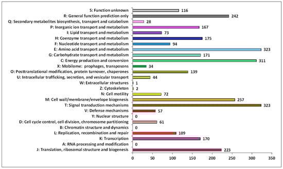 Functional classification in Clusters of Orthologous Groups of proteins (COG). The X-axis indicates the number of genes in functional categories.