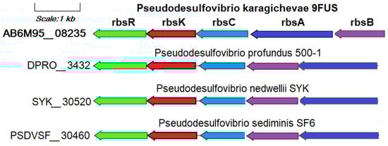 This gene is part of the ribose operon rbsBACKR (AB6M95_08235-08260), together with the unique genes identified in the pangenomic analysis of the ribose ATP-binding cassette transport system: rbsA (ribose transport system ATP-binding protein RbsA, EC: 7.5.2.7), rbsB (ribose transport system substrate-binding protein RbsA), and rbsC (ribose transport system permease protein RbsC), as well as the rbsR gene encoding DNA-binding transcriptional repressor of ribose metabolism (Figure 6). The ribose transport system proteins RbsA, RbsB, and RbsC work together to import ribose efficiently, particularly in nutrient-limited environments, by leveraging the energy from ATP hydrolysis for active transport across the membrane [70]. In addition to the genome of strain 9FUST, the ribose metabolism operon is annotated only in the genomes of P. profundus 500T, P. nedwellii SYKT, and P. sediminis SF6T. The use of ribose as a substrate is a rare property for bacteria of the genus Pseudodesulfovibrio that is not related to the source of their allocation.