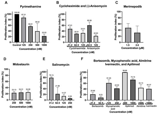 Proliferation index of the best drugs of the COVID-Box after 24 h of treatment with different concentrations of (A) Pyrimethamine, (B) Cycloheximide, Anisomycin, (C) Merimepodib, (D) Midostaurin, (E) Salimomycin, (F) Bortezomib, Mycophenolic acid, Apilimod, Almitrine, and Ivermectin. Values represent mean ± SD of three experiments, except for merimepodib, salinomycin, and pyrimethamine (two experiments).