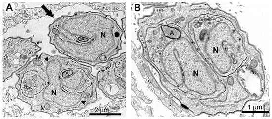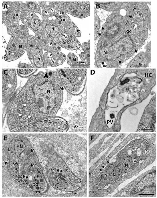 Treatment with 1 μM ivermectin (Figure 4C,D) induced the formation of myelin-like structures [,] (arrowhead in Figure 4C and inset), resembling a process of cell death by autophagy. In Figure 4D, tachyzoites show large vacuoles containing membranous material (asterisks) and a lobular nuclear shape. In one parasite, it is possible to observe the construction of two daughter cells (arrowheads in Figure 4D), but a nucleus lobule (arrow) is not involved by one of the daughter cells.