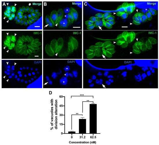 Fluorescence microscopy of untreated parasites (A) or after treatment with 31.2 nM (B) and 62.5 nM (C) of bortezomib. Parasites were labeled with anti-IMC1 for inner membrane complex (IMC, green) and DAPI for DNA (blue). (A) Untreated parasites showed typical morphology (arrow) and division process (arrowhead). (B,C) treated parasites showed an aberrant cell division process with large parasites harboring two or more nuclei (arrow), daughter cells without nuclei (arrowheads), and regions of the cells without IMC coverage (asterisks). (D) Quantitative analysis of the number of PVs presenting parasites with aberrant cell division. Results in (D) are the mean ± SD of two independent experiments. * p < 0.05; **p < 0.01; *** p < 0.001. Bars = 2.5 µm.