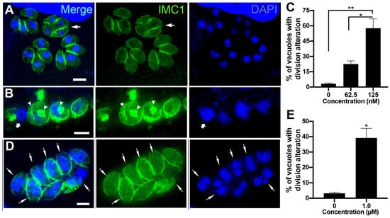 Fluorescence microscopy analysis of tachyzoites treated with 62.5 nM and 125 nM (-)-anisomycin (A–C) and 1 µM ivermectin (D,E). Parasites were labeled with anti-IMC1 for inner membrane complex (IMC, green) and DAPI for DNA (blue). (A) Parasites treated with 62.5 nM (-)-anisomycin showed daughter cells’ budding arrestment, forming a large mass of tethered daughter cells (arrow). (B) Treatment with 125 nM (-)-anisomycin led to a large round mass of cells with a nucleus of increased size and disorganized profiles of IMC (arrowheads). The arrow points to a parasite region without the IMC coverage. (C) Quantitative analysis of the number of PVs presenting parasites with aberrant cell division after treatment with (-)-anisomycin. (D) Parasites treated with 1 µM ivermectin showed a divided nucleus without the construction of daughter cells (arrows). (E) Quantitative analysis of the number of PVs presenting parasites with aberrant cell division after treatment with ivermectin. Results in (C,E) are the mean ± SD of two independent experiments. * p < 0.05; ** p < 0.01. Bars = 2 µm.
