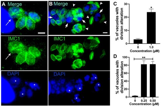 Fluorescence microscopy analysis of tachyzoites treated with almitrine and midostaurin. Parasites were labeled with anti-IMC1 for inner membrane complex (IMC, green) and DAPI for DNA (blue). (A) Parasites treated with 1 µM almitrine showed cell division alteration with tachyzoites presenting large nuclei (asterisks) and masses with incomplete division process (arrow). (B) Treatment with 0.25 µM midostaurine caused a large round mass of cells with a nucleus of increased size (asterisk), tachyzoites showing regions without the IMC cover (arrows), and daughter cells without a nucleus (arrowheads). (C) Quantitative analysis of the number of PVs presenting parasites with aberrant cell division after treatment with almitrine. (D) Quantitative analysis of the number of PVs presenting aberrant parasites after treatment with midostaurin. Results in (C,D) are the mean ± SD of two independent experiments. * p < 0.05; ** p < 0.01. Bars = 2.5 μm.