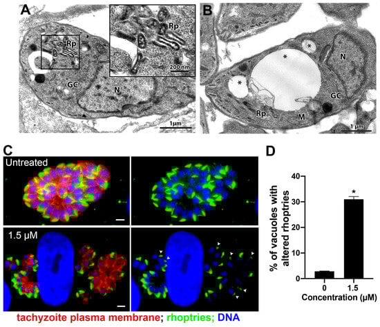 Morphological analysis of tachyzoites of T. gondii after treatment with 1.5 µM merimepodib. (A) Treatment with 1.5 µM induced Golgi complex fragmentation (vesiculation) and rhoptry disorganization, which can be seen at higher magnification in the inset. (B) Tachyzoites treated with 1.5 µM merimepodib also presented large vacuoles containing membranous material (asterisks). (C) Fluorescence microscopy analysis of tachyzoites treated with 1.5 µM merimepodib for 24 h. Parasites were labeled with anti-ARO for rhoptries (green), anti-SAG1 for parasite plasma membrane (red), and DAPI for DNA (blue). Images represent the projection of different Z focal planes. (D) Quantitative analysis of the number of PVs presenting parasites with rhoptry- altered morphology (arrowheads in (C)). Results are the mean ± SD of two independent experiments. * p < 0.05. M—mitochondria; N—nucleus; GC—Golgi complex; Rp—rhoptries. Bars = 2 µm.