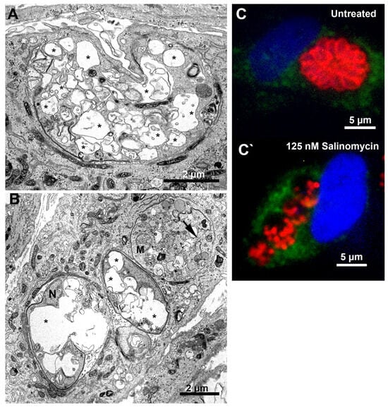 Treatment with 250 nM mycophenolic acid affected the tachyzoites’ division process (Figure 9A,B). Parasites in the division process presenting multiple lobules (arrowheads in Figure 9A) or mitotic nuclei (horseshoe shape) without the construction of new daughter cells were observed (arrow in Figure 9A). Even daughter cells presented a mitotic nucleus before completing the division process (N in Figure 9B). Tachyzoites treated with 125 and 250 nM salinomycin showed an extensive vacuolization process (asterisks), suggesting an advanced cell death process (Figure 10A,B, respectively). PVs containing lysed parasites (arrow in Figure 10B) were also observed. Analysis by fluorescence microscopy after treatment with 125 nM salinomycin and labeling the parasite plasma membrane (red) and host cell lysosomes (green) showed that differently from untreated cells that had PVs with parasites’ typical morphology and organized in rosettes (Figure 10C), treated parasites showed vacuoles containing fragmented parasites (Figure 10C′). PVs with lysed parasites did not show fusion with lysosomes.