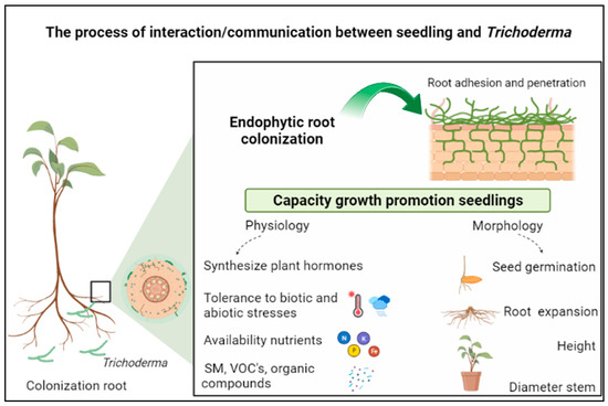 From there, the endophytic colonization begins, where the microorganism assists the development and growth of seedlings through the emission of chemical signals that allow the best plant development due to the symbiosis process. Consequently, shoot and root biomass are improved; seedlings also have greater resistance and responses to stress conditions [67,68].