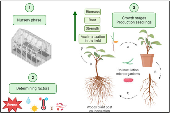 During the nursery phase (production of forest seedlings), several factors can influence positively or negatively the production capacity of plants, so it is essential to insert viable technologies to increase plant production (Figure 4). The system of “consortium” (combination of two or more microorganisms) segmented through the co-inoculation of microorganisms is a valuable alternative in the seedling development stage [113].