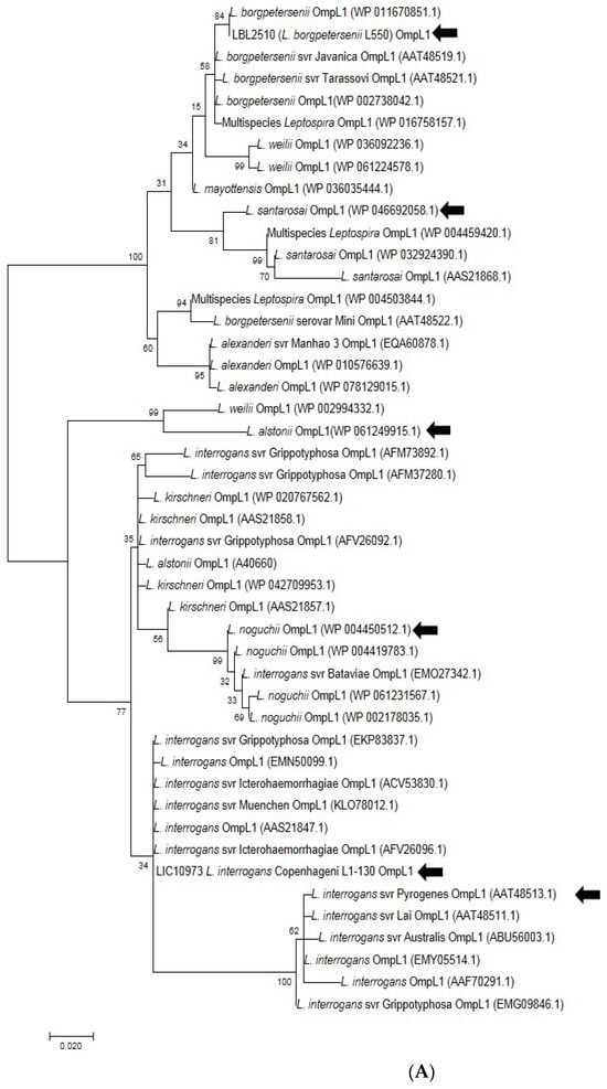 Five amino acid sequences of OmpL1 and five amino acid sequences of rLBL2618, representing the diversity across all pathogenic Leptospira genomospecies, were selected from different distinct representative deep branches of the phylogenetic tree (Figure 8A,B). A CLUSTALW alignment [39] showed that the shared amino acid sequence identity for OmpL1 was ≥85%, in line with a previous study [40]. The amino acid sequence identity for LBL2618 was ≥65%, with all sequences annotated with Domain of Unknown Function 1566 (DUF1566).