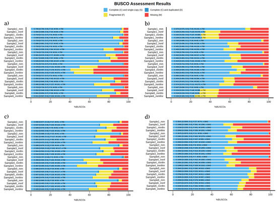 Genome completeness is majorly affected by sequencing methods and genome assembly tools rather than read correction tools [33]. The higher number of genome completeness observed in uncorrected assemblies in this study was due to minimap2 assembly, which is a reference-based alignment method. Other studies using de-novo genome assembly methods show—with sufficient sequencing depth—the advantages of using read correction tools in BUSCO analysis [33,34].