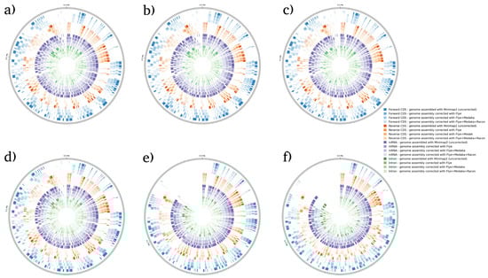 The sum of genome completeness, duplication rate, genome fragmentation, and missing genes were evaluated by Universal Single-Copy Orthologues (BUSCO) (version 5.2.2) [23]. Accurate eukaryotic gene structure annotation of the consensus FASTA files was assessed with BRAKER1 (version 3.0.3) with GeneMark-ET. The generated GFF3 files containing complete coding DNA (CDs), forward CDs, reverse CDs, mRNA, and introns were then visualized with pycirclize (version 0.5.1) (https://github.com/moshi4/pyCirclize, accessed on 1 September 2023) [24,25,26,27]. InterProScan (European Molecular Biology Laboratory’s European Bioinformatics Institute) (version 5.63–95.0) was used to fully analyse and classify eukaryotic functional proteins using ProSiteProfiles analysis [28]. All consensus FASTA files, codes, and commands are available at https://github.com/hussainsafar/eukaryotes_read_correction, accessed on 1 September 2023.