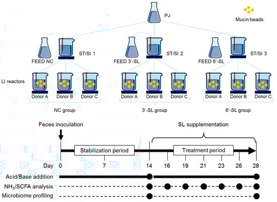 The experiment consisted of stabilization (days 0–14) and the SL treatment period (days 15–28). On day 0, the LI reactors of each of the nine units were filled with 250 mL of SHIME nutritional medium (PDNM002B, Prodigest) and inoculated with a fecal suspension (5% v/v) of one of the three donors investigated (Donor A, B or C), as prepared according to Moens et al. [25]. Each ST/SI reactor received three feeding cycles per day of 210 mL of SHIME nutrition medium (FEED) and 90 mL of bile/pancreatic juice (PJ, oxgall (Becton, Dickinson and Company, 6 g/L), sodium bicarbonate (12.5 g/L), and porcine pancreatin (0.9 g/L)). Then, the content of the reactor was pumped to the LI, and excess liquid was removed from the waste vessel. During the stabilization period (days 0–14), all the ST/SI reactors received the FEED without additional ingredients. During the treatment period (days 15–28), the FEED pumped into one of the three ST/SI was added 3′-SL (6 g/L), the FEED pumped into another ST/SI was added 6′-SL (6 g/L), and nothing was added to the remaining FEED as a negative control (NC). In summary, 9 LI conditions were performed to combine three donors (A, B, and C) and three conditions of FEED (NC, 3′-SL, and 6′-SL). The culture broth was sampled in the LI reactors every 2 or 3 days after the 9th day of inoculation (days 9, 12, 14, 16, 19, 21, 23, 26, and 28). After 5 min of centrifugation at 4 °C, 15,000 rpm, the pellet and supernatant derived from the culture broth were collected for DNA extraction and metabolites analysis, respectively (Figure 1).