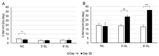 Consumption of HCl (A) and NaOH (B) during the SHIME experiment. *: p < 0.05, **: p < 0.01. NC = negative control, 3′-SL = 3′-sialyllactose, 6′-SL = 6′-sialyllactose.