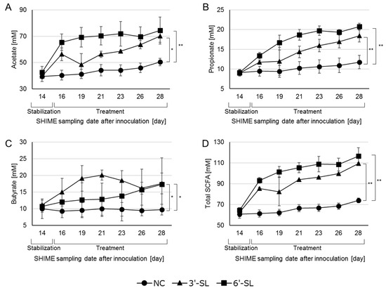 Effect of SL treatment on acetate (A), propionate (B), butyrate (C), and the total short-chain fatty acid (SCFA) concentration (D) in the SHIME culture. *: p < 0.05, **: p < 0.01. NC = negative control, 3′-SL = 3′-sialyllactose, 6′-SL = 6′-sialyllactose.