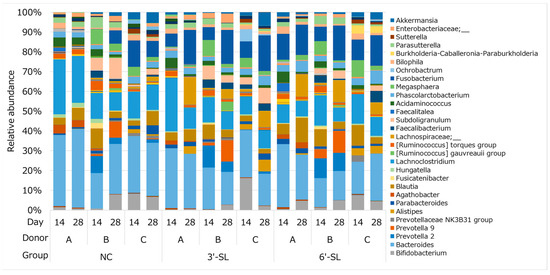 Effect of SL treatment on the microbial composition. Only taxa with a statistical difference in relative abundance between days 14 and 28 in the SHIME culture were manually selected and presented in the table, except for Bifidobacterium. The values presented are the averages of the relative abundances (%) of the three adult human donors tested (n = 3). Statistical differences in the relative abundance between days 14 and 28 are indicated in bold. NC = negative control, 3′-SL = 3′-sialyllactose, 6′-SL = 6′-sialyllactose.