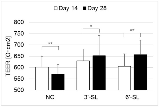 Caco-2 epithelial permeability assay. *: p < 0.05, **: p < 0.01. NC = negative control, 3′-SL = 3′-sialyllactose, 6′-SL = 6′-sialyllactose.