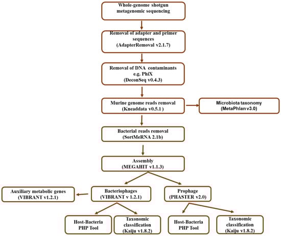 Although the use of artificial microbial consortia in gnotobiotic murine models has been well established in human microbiome research, there is limited knowledge regarding the diversity of viruses, particularly bacteriophages in these models. These viruses may significantly influence the effects of the introduced microbiota, impacting their abundance, phenotype, and genome structure []. The virome is primarily composed of bacteriophages, prophages, rarer eukaryotic viruses, and endogenous retroviruses []. Studies have reported that the virome community shape the dynamics and diversity of the bacterial population through lytic interaction, horizontal gene transfer, encoded virulence proteins, and metabolic genes [,,,,].