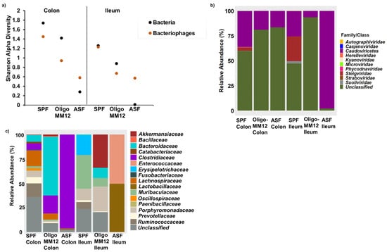 In our study, we observed that the diversity of bacteriophages increased with increasing bacterial diversity (Figure 2a). Diversity was generally higher in colon samples especially in SPF. The bacteriophage contigs were taxonomically assigned to nine families and one class (Figure 2b), for some contigs, viral hallmark genes were detected, but lineages could not be further classified. Bacteriophages belonging to class Caudoviricetes dominated all samples with different relative abundances. In ASF, class Caudoviricetes showed a higher relative abundance in the ileum samples compared to the colon; unclassified were more abundant. Unknown families were only detected in colon samples with a high frequency. In both Oligo-MM12 gut compartments, class Caudoviricetes dominated more in the colon compared to the ileum. Contigs that could not be assigned to the family level were present in high abundance in the colon and ileum samples. In SPF, the classes Caudoviricetes and Steigviridae were equally abundant in the ileum. In addition, some contigs which could not be further assigned were found. The highest diversity was found in the colon of SPF mice. Here, Casjensviridae, Herelleviridae, Autographiviridae, Kyanoviridae, Straboviridae, Suoliviridae, Phycodnaviridae and Microviridae were detected, but in relatively lower abundances compared to class Caudoviricetes. Also, in these samples from SPF mice, some contigs could not be further assigned to the family and class level.
