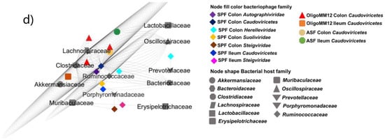 In ASF, predicted bacterial hosts for class Caudoviricetes were again Lactobacillaceae classified Lactobacillus murinus in the ileum, and Clostridiaceae classified Clostridium sp. in the colon. In Oligo-MM12, bacterial hosts for class Caudoviricetes were Lachnospiraceae classified Clostridium innocuum and Clostridium clostridioforme in the colon, and Akkermansiaceae classified Akkermansia muciniphila in the ileum. Like for bacteriophages, host bacteria diversity was higher in SPF, especially in the colon. The class Caudoviricetes interacted mainly with Lachnospiraceae and Ruminococcaceae in the colon, whereas Porphyromonadaceae were identified as bacterial hosts for Steigviridae in the ileum (Figure 3c,d).